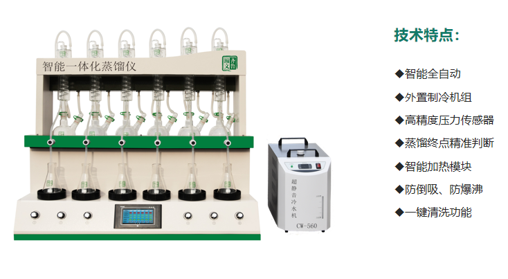 一體化蒸餾儀自動(dòng)完成加熱、去皮、控溫、壓縮機(jī)制冷、冷卻水循環(huán)和蒸餾終點(diǎn)判斷。